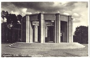 Bei der nach dem 1. Weltkrieg von den Siegermächten angeordneten Volksabstimmung stimmten seinerzeit 97,5 % für den Verbleib bei Deutschland. Nur 7.980 Stimmen von 363.209 wurden für Polen abgegeben. In Würdigung dieses überwältigenden Bekenntnisses zum Deutschen Reich benannte man das Theater um und errichtete1928 ein eindrucksvolles Abstimmungsdenkmal im Stadtteil Jakobsberg. Architekten waren Walter und Johannes Krüger aus Berlin. Seine elf Säulen standen für die elf masurischen Abstimmungskreise. Nach 1945 riß man das Denkmal ab und ersetzte es 1972 durch das polnische „Denkmal für die Helden des Kampfes für die nationale und soziale Befreiung von Ermland und Masuren“.[4]
