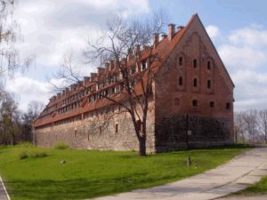 Der Speicherbau der Vorburg mit Wehrgeschoß entstand im 3. Viertel des 14. Jhs. und ist ein Ziegelbau auf Feldsteinfundament. Die Giebel der Schmalseiten zieren Blenden, die Dächer wurden in der Neuzeit abgeflacht. Im August 1990 brannte der mittlere Teil des Hauses aus. Ein russischer Investor hatte bald nach 1990 mit Unterstützung der Eliks-Bank angefangen, das Haus zum Hotel auszubauen. Er schaffte es gerade noch, den Südflügel der Vorburg zu 80 Prozent zu sanieren und dessen einst durchgehendes Dach mit wenig stilgerechten Mansardenfenster zu versehen, als ihn 1998 der Rubelsturz ereilte und in den finanziellen Ruin trieb. In der Folge schlachteten Diebe das Gebäude aus, nahmen Dachpfannen und Ziegelsteine mit und brachen die verglasten Fensterrahmen der Mansarden heraus.