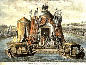 In den Mittelpunkt des Weltinteresses rückte die Stadt 1807, als am 7. und 9. Juli auf einem Floß in der Mitte der Memel die Friedensschlüsse zwischen Frankreich und Russland sowie zwischen Frankreich und Preußen geschlossen wurden. Die Bedingungen für Preußen waren nicht sehr günstig. Daran änderte auch eine persönliche Unterredung von Königin Luise mit Napoleon in der Schloßmühlenstraße 11 nichts. Sie verschaffte sich ihm gegenüber allenfalls ein wenig mehr Respekt, wohingegen sie in der Öffentlichkeit damit Ruhm erntete. Nur Zar Alexander verhütete Schlimmeres, weil er Interesse an der Aufrechterhaltung einer Pufferzone hatte. Preußen verlor mit dem Friedensvertrag von Tilsit sämtliche Gebiete westlich der Elbe und musste die bei den polnischen Teilungen erworbenen Gebiete Südostpreußen und Neuostpreußen an das Herzogtum Warschau abtreten.