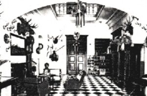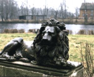 Der Mittelvorbau wird durch eine Vorhalle auf Pfeilern betont. An den Portalen lagern zwei eindrucksvolle Bronzelöwen, die seinerzeit auf der Pariser Weltausstellung 1889 erworben worden waren. Der westliche wacht, der östliche schläft. Diese Löwen haben inzwischen eine Geschichte. Die Entwürfe stammen von Christian Daniel Rauch (1777 – 1857) und Theodor Kalide (1801 – 1863). In der Königlich Preußischen Eisengießerei in Gleiwitz wurden ab 1822 mehrere Exemplare gegossen. Von dem wachenden Löwen sind 7 Abgüsse bekannt und einer davon steht vor dem Eingang zum Gutshaus Juditten. Der schlafende Löwe wurde wohl 17 Mal gegossen, die sich neben dem in Juditten fünf weitere Male in Polen befinden. Acht Exemplare gibt es in Deutschland, weitere in Tschechien und in Estland.[2]