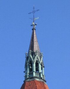 Die Turmspitze erhielt erst nach größeren Reparaturarbeiten 1867/68 die gegenwärtige Gestalt, wobei der goldene Stern vom Erstbau 1596 ist, damals gestiftet von Bürgermeister Eustachius Ludewich. Neogotische Veränderungen an der Fassade erfolgten 1866 – 1868 unter Leitung von Baurat Nöring unter Beteiligung des preußischen Landeskonservators Ferdinand v. Quast und des Schinkel-Schülers August Stüler. Zugleich bereinigte man den Innenraum von damals nicht geschätzten Barockelementen, wobei die wesentliche Anregung dazu vom Inhaber der Adler-Apotheke, Balthasar Joseph Ost (1827 – 1915) kam [2]. Im Jahr 1896 brannte es in der Kirche, wobei der Hauptaltar mit seinen unschätzbaren flämischen Malereien, der gerade aus der St.-Anna-Kapelle des Schlosses hierher verlagert worden war, abbrannte [3]. 1899 erneuerte man das Dach. Im Jahr 2001 erhielt die Kirche ein repräsentatives Hauptportal aus Bronze.