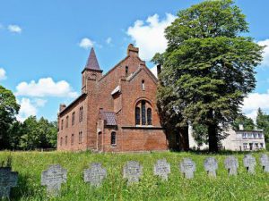 Schon 1864 war Laugszargen als eigener Seelsorgebereich von Willkischken abgezweigt worden, aber erst 1899 wurde es selbstständig, nachdem bereits Kirche und Pfarrhaus vorhanden waren. Zunächst hatte ein Beetsaal als gottesdienstliche Stätte dienen müssen, 1887 war die Kirche errichtet worden als ein unverputzter Ziegelbau mit vorgelegtem Turm. Noch im gleichen Jahre wurde eine Orgel erworben. 1914 wurde die Kirche beschädigt, im November 1924 konnte sie nach umfangreichen Bauarbeiten wieder eingeweiht werden. Letzter Pfarrer war Joachim Killus. Die Kirche überstand den Krieg und wird als Gotteshaus weiter genutzt.[2]Im Osten der Kirche liegt ein Soldatenfriedhof.