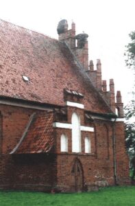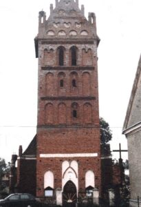 Von der Kirche entstand nach neuesten Erkenntnissen das Langhaus 1440 – 1448 und der Turm ca. 1450 mit Portal in hoher Nische. Der 7teilige Ostgiebel ist charakteristisch für ermländische Ordensbauten und zeigt eine enge Verwandtschaft zum Giebel der Kirche in Freudenberg westlich von Seeburg. [1] Die Giebel wurden nach dem Einsturz 1800 gotisierend erneuert. Sakristei mit Tonnengewölbe im Norden, Vorhalle im Süden mit Filialaufsätzen, um 1800.