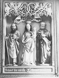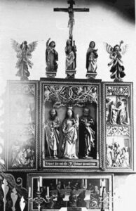 • Flügelaltar um 1500, zusammengesetzt in der heutigen Form 1694 mit hinzugefügter Predella von Fallor Schmaltz aus Nordenburg und zwei Engeln von einem Königsberger Schnitzer von 1709;