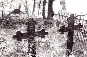 Die Kirche in Muszaki – Muschaken und das Pfarrhaus gegenüber wurden in den Kriegshandlungen 1945 zerstört, die Kirche aber später von den Polen auf den alten Fundamenten neu aufgebaut.[1] Im Ursprung stammte sie aus dem Beginn des 16. Jhs., brannte 1885 ab, wurde aber bald wieder aufgebaut. Während der Tannenbergschlacht 1914 belegten die Russen den Turm mit zwei Maschinengewehren und nahmen von dort oben Dorfbewohner unter Beschuss. Erst eine Kompanie deutscher Soldaten machte diesem Treiben ein Ende, eroberte den Turm und verhinderte gleichzeitig, dass die Kirche in Brand gesetzt wurde.[2] Der Friedhof in Muschaken wurde verwüstet und 1979/80 teilweise mit einer Planierraupe eingeebnet. Dennoch sind einige alte Grabstellen noch erkennbar, so die für den Pfarrer Johannes Ebel und seine Frau Dr. Auguste Ebel sowie für Max Kompa und Heinrich Kompa.[3]