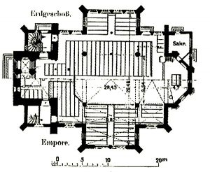 Verantwortlich für den Bau der Kirche war Regierungsbaumeister Eitner. Der Backsteinbau mitKlosterformatsteinen und den gotischen Fenstern ahmt das Bild der Ordensbauten nach. Neben der Kirche entstanden die beiden hintereinander liegenden Pfarrhäuser, wobei sich im Untergeschoss mit Zugang von der Straße ein Gemeinde- bzw. Konfirmandensaal befindet.[1]