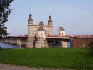 Das große Portal der Luisenbrücke hat überlebt. Ursprünglich wurde die Memel ab etwa 1600 mit einer Fährverbindung überquert. Die Russen schufen aus strategischen Gründen während der Zeit ihrer Besetzung Ostpreußens im siebenjährigen Krieg eine Floßbrücke, die sie aber beim Abzug wieder zerstörten. Doch den Vorteil einer Brückenverbindung hatte man jetzt erkannt und es kam mit Genehmigung des Königs zum Bau einer Schiffsbrücke, die 1767 in Betrieb ging. Diese wurde zweimal täglich auseinander geschwenkt, um Schiffe, Boydaks und Holzflöße durchzulassen. Im Winter ruhte die Brücke abgeschwenkt bis zum Frühjahr. Die Überquerung der Memel wurde in dieser Zeit notdürftig mit Fährkähnen und Schlitten aufrecht erhalten oder kam bei starkem Eisgang oder Hochwasser völlig zum Erliegen. Eine Entspannung des Transportsituation brachte der Bau der Eisenbahnbrücke über die Memel ab 1875, weil der Gleiskörper außerhalb des Zugverkehrs auch für Fuhrwerke genutzt werden konnten.[13]