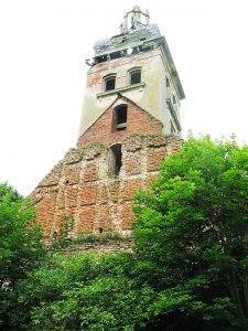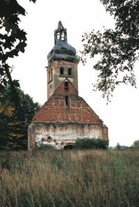 Ab 1626 ist in Popelken ein Pfarrer nachgewiesen und eine Kirche existierte seit 1640. Diese wurde 1768/69 durch einen Neubau ersetzt und 1901 um einen Turm ergänzt. Die Kirche kam unversehrt über den 2. Weltkrieg und diente danach als Halle zur Trocknung von Getreide. Die Glocke hatte man als Altmetall verwertet. Nach 1970 wurde der Turmhelm beschädigt. Im Dachstuhl darunter fand man Münzen und Fotografien der Kirche. Wegen fehlender Instandhaltung verfiel die Kirche sehr rasch. 1996 stand nur noch der blessierte Turm.
