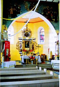 Die Kirche in Scharnau stammt aus vorreformatorischer Zeit, verändert in der zweiten Hälfte des 17. Jhs.[1]. Präziser: die alte Holzkirche von Scharnau wurde um 1695 gebaut und ersetzte einen baufälligen Vorgängerbau. Von 1809 bis 1832 war sie Filialkirche von Borchersdorf, danach bis 1894 Filiale von Saberau und war dann ein eigenständiges Kirchspiel. Diese alte Holzkirche riß man 1910 ab und ersetzte sie 1912 durch einen Neubau. Dieser zählt zu den schönsten ländlichen Kirchen im Kreis Neidenburg. Heute ist die Kirche katholisch und dem heiligen Antonius geweiht.[2]